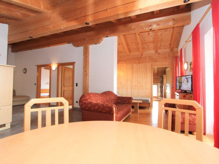 Appartement 4-kamers 86 m2, op de bovenste verdieping. Smaakvol en gezellig ingericht: hal. 1 kamer met 1 bed en 1 2-pers bed (140 cm). 2 2-pers. kamers. Woonkamer met Sat-TV (Flatscreen TV). Uitgang naar het balkon. Open keuken (oven, afwasmachine, 4 keramische glas kookplaten) met eethoek. Uitgang naar het balkon. Bad/WC. Balkon. Mooi panoramazicht op de bergen, het dal en het landschap. Ter beschikking: Internet (Internet (WiFi), extra). Rookmelders.
