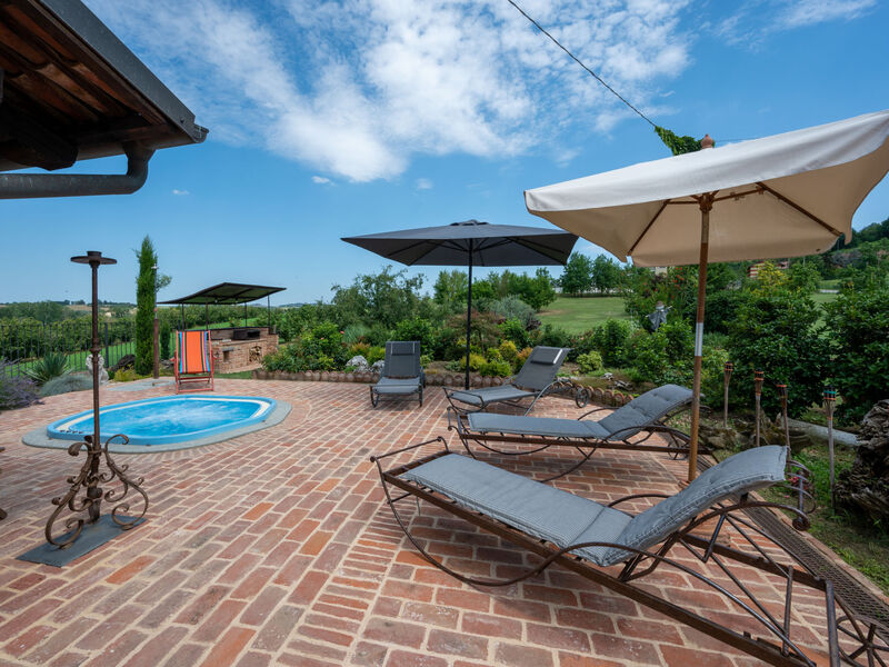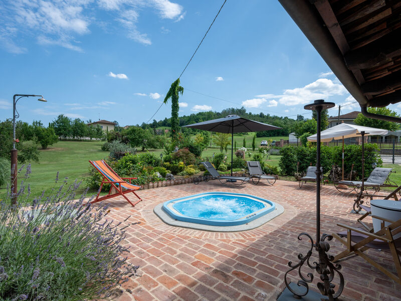 Groot cottage "La Bell'aria", vrijstaand. Aan de rand van de plaats, 1 km van het centrum van Frinco, verhoogde ligging. Voor alleengebruik: terrein 4.500 m2 (omheind) met planten en bomen, wilde tuin, weide. Buitendouche, hot tub, tafeltennis, badminton, patio, prieel (20 m2), terras, tuinmeubelen, grill, parkeerplaats (voor 3 auto's) bij het huis op het terrein. Bushalte 1 km. Attracties in de buurt: Asti 15 km, Casale Monferrato 37 km, Alba 45 km, La Morra 55 km, Barolo 52 km, Torino 76 km. Auto noodzakelijk. het kuuroord is geopend van 30.04.-15.09. Gasten kunnen gebruikmaken van het zwembad (20 x 4 m, 01.06.-15.09.) En de snackbar van Agriturismo, ongeveer 100 m, tegen betaling (EUR 15 per persoon per dag).